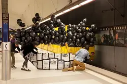 The full exhibition consists of two videos and an installation of the boat, shown without balloons to depict the
